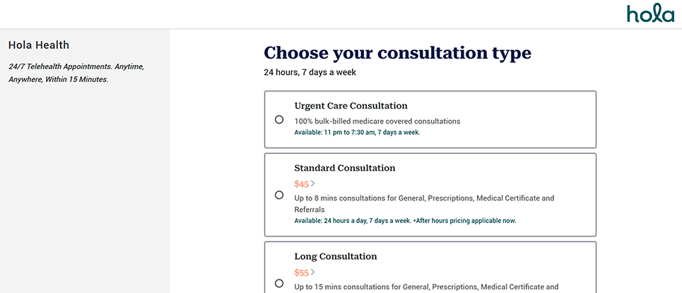 | Hola Health | $5.99-$63 | Some bulk-billing available | 24/7 | Telehealth consultations, instant scripts, medical certificates, pharmacy delivery, mental health treatment plan | Within 15 minutes for a doctor’s consultation, within 2 hours for medication delivery (anywhere) | Mobile Application + Website | Book Now |