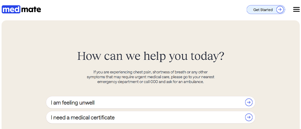 | Medmate | $19.9-$349 | Medicare rebate available (eligibility applies) | 7am to 10pm daily | Doctors’ consultations, medical certificates, prescriptions and online pharmacy ordering, pathology, imaging, specialist referrals, comprehensive weight loss services, comprehensive partnered mental health services | Within one hour | Mobile Application + Website | Book Now |