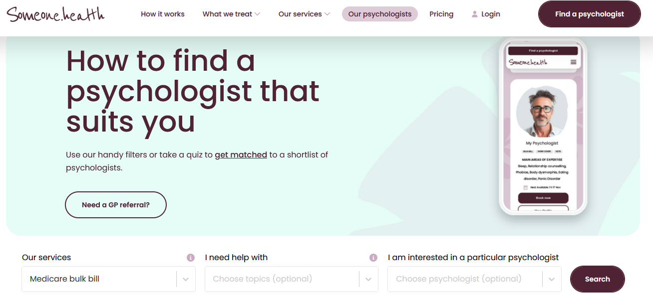 Comprehensive telepsychology provider with 21/7 access, matching service, and a free session, if you want to try a different psychologist. MyMirror also offers a free telehealth consult with a GP via its telehealth partner Hola Health, giving you access to a mental health care plan and potentially fully bulk billed sessions. (The latter requires an application process and takes a few days to be confirmed, whereas services with a gap fee are available immediately.)